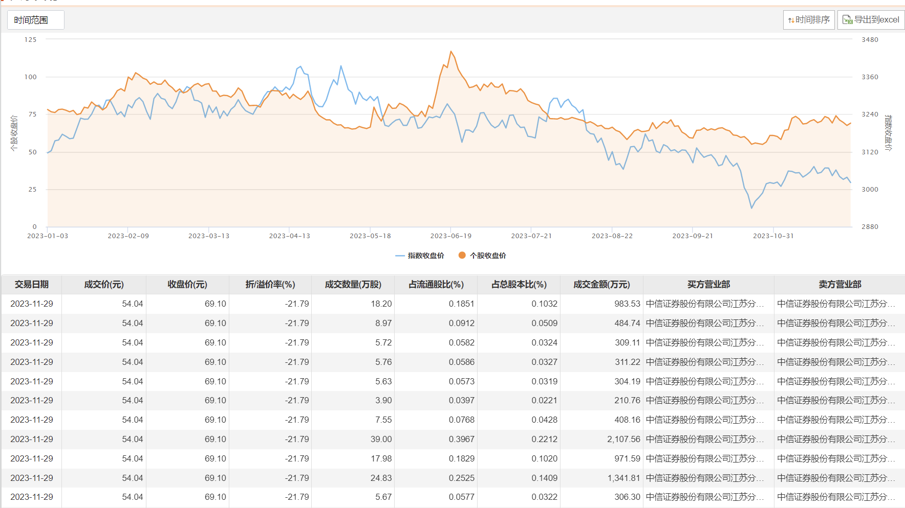 今日大宗交易成交143.21万股,成交额7738.97万元,占当日总成交额的18.32%,成交价54.04元,较市场收盘价折价21.79%。