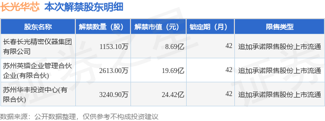 证券之星消息,根据市场公开信息整理,长光华芯(688048)于10月9日将有7007.0万股限售股份解禁,为公司追加承诺限售股份上市流通,占公司总股本39.75%。(本次数据根据历史公告整理得出,实际情况以上市公司最新公告为准)最近一年内,该股累计解禁658.45万股,占总股本的3.74%。本次解禁后,公司已无限售股份。具体如下图所示: