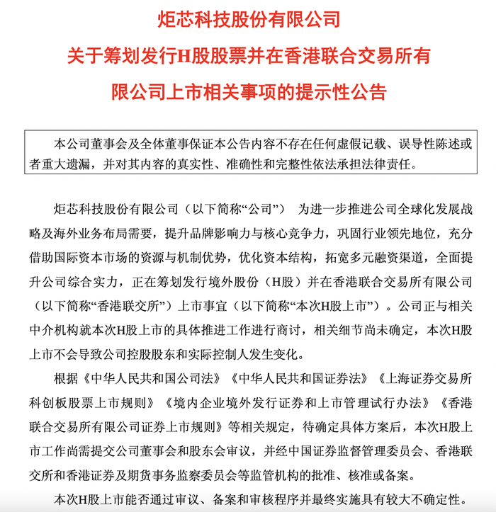 炬芯科技表示,公司正与相关中介机构就本次H股上市的具体推进工作进行商讨,相关细节尚未确定,本次H股上市不会导致公司控股股东和实际控制人发生变化。本次H股上市能否通过审议、备案和审核程序并最终实施具有较大不确定性。