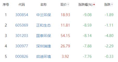 中兰环保、正和生态、国泰环保、深圳瑞捷、启迪环境位列涨幅榜后五位,涨幅分别为-9.08%、-8.59%、-8.14%、-7.88%、-7.76%。