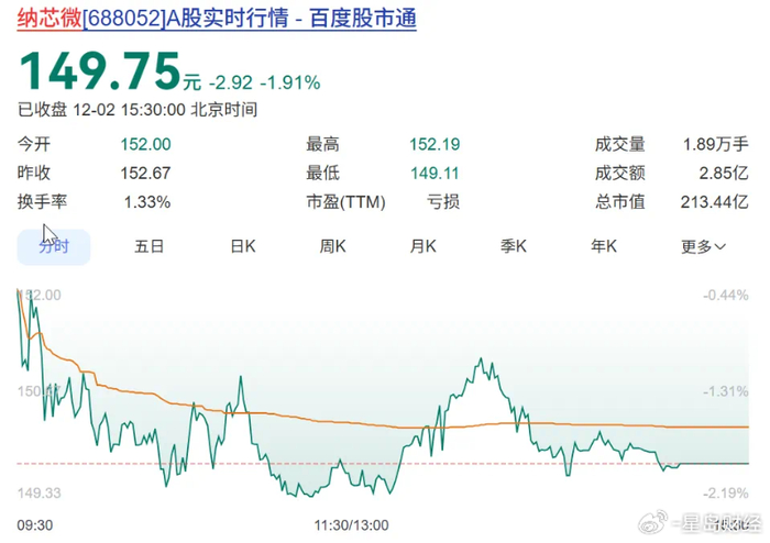 截至12月2日收盘,纳芯微A股报收于149.75元/股,较前一交易日下跌1.91%,总市值213.44亿元。
