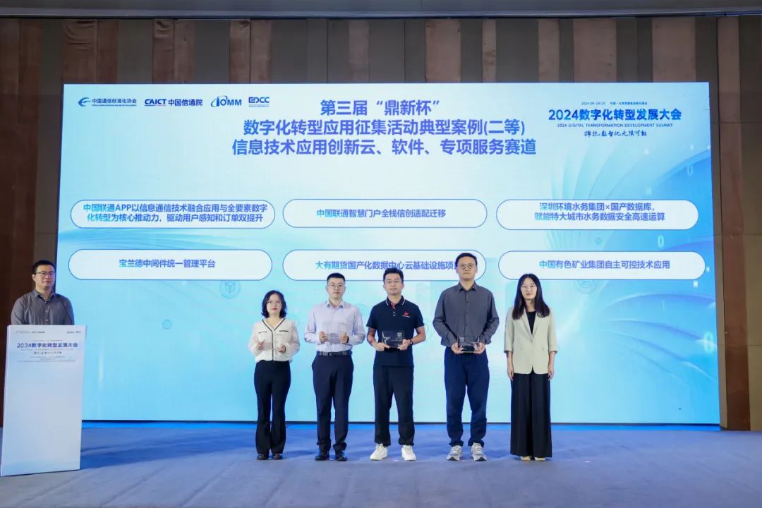 9月24日-25日,“2024数字化转型发展大会”在北京成功举办。来自政产学研用的专家学者、知名企业代表同台论道,共话数字化转型的新趋势。大会期间,备受瞩目的第三届“鼎新杯”数字化应用转型大赛结果正式揭晓,「宝兰德中间件统一管理平台」凭借前沿的技术实力和创新实践能力荣获数字化转型应用案例二等奖!