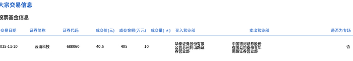 云涌科技今日大宗交易折价成交10万股,成交额405万元