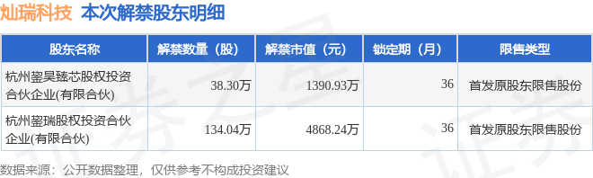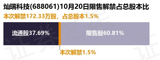 灿瑞科技(688061)172.33万股限售股将于10月20日解禁,占总股本1.5%