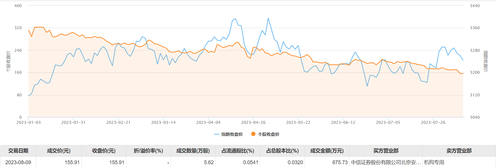 8月9日大宗交易成交5.62万股,成交额875.73万元,占当日总成交额的1.54%,成交价155.82元,较市场收盘价155.91元折价0.06%。