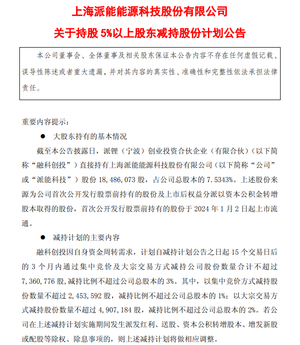 派能科技:融科创投拟减持不超3%股份,不超过736.08万股