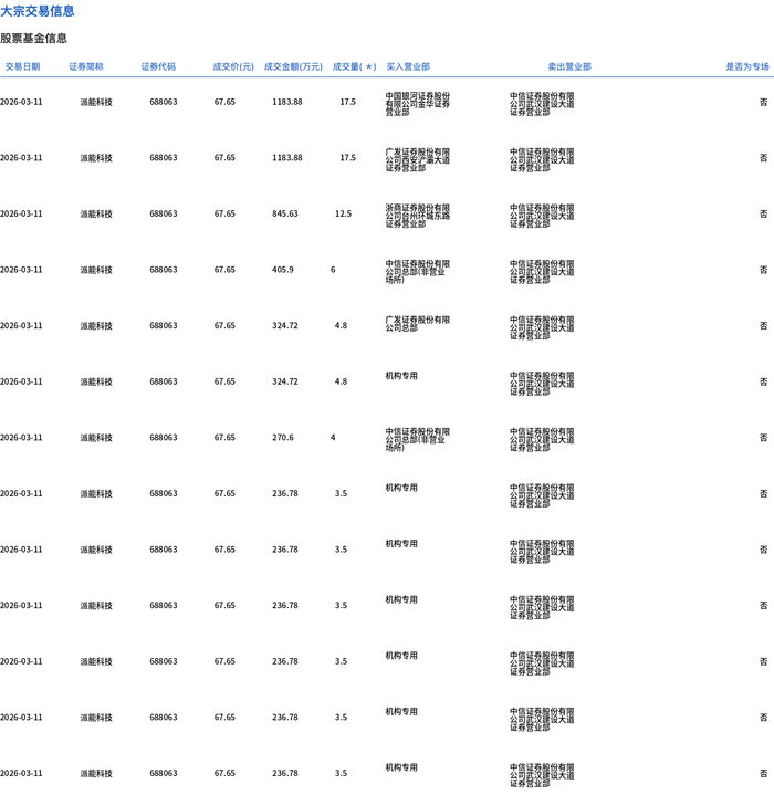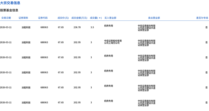 3月11日,派能科技大宗交易成交106.6万股,成交额7211.54万元,占当日总成交额的4.71%,成交价67.65元,较市场收盘价72.97元折价7.29%。