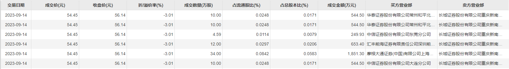 9月14日大宗交易成交80.59万股,成交额4388.13万元,占当日总成交额的28.66%,成交价54.45元,较市场收盘价56.14元折价3.01%。