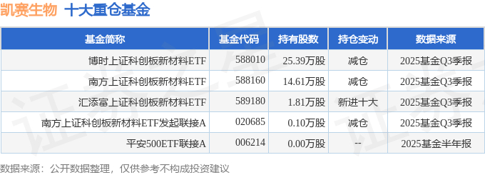 持有凯赛生物最多的基金为博时上证科创板新材料ETF,目前规模为2.91亿元,最新净值0.8339(10月31日),较上一交易日下跌1.86%,近一年上涨41.65%。该基金现任基金经理为唐屹兵。