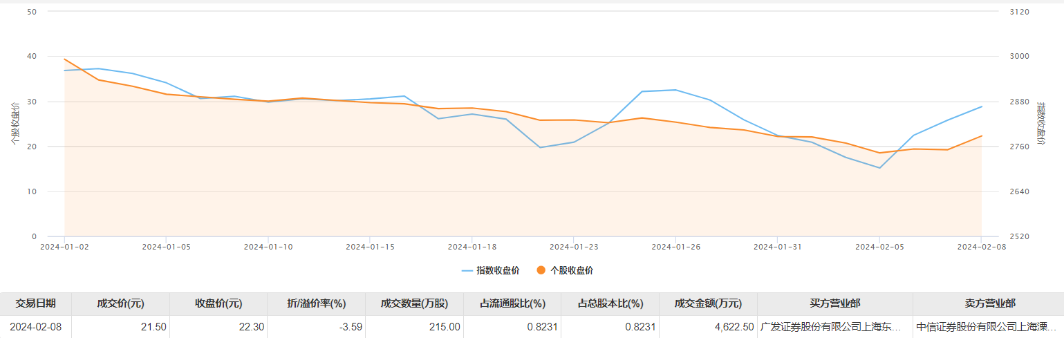 2月8日大宗交易成交215万股,成交额4622.5万元,占当日总成交额的14.38%,成交价21.5元,较市场收盘价折价3.59%。