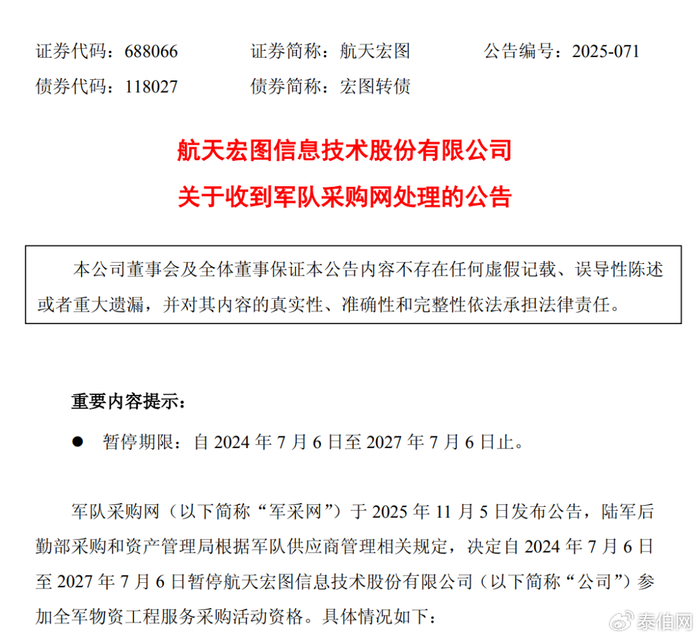 泰伯网讯,11月5日,航天宏图发布公告,军采网决定自2024年7月6日至2027年7月6日暂停公司参加全军物资工程服务采购活动资格。
