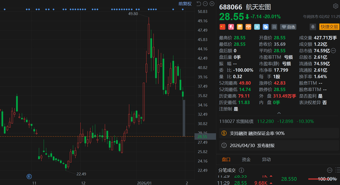 格隆汇2月2日|航天宏图(688066.SH)一字板跌停,目前封单金额高达5.29亿元,报28.55元,总市值74.6亿元。消息上,航天宏图上周五盘后公告称,经初步测算,预计2025年净利润为-10.30亿元,扣非净利润-10.80亿元左右,期末净资产为-2.80亿元左右。因审计未完结,数据存在不确定性,若期末净资产为负,公司将可能在2025年年报披露后被实施退市风险警示。