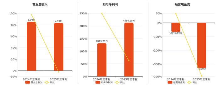 公司营业总收入为2.93亿元,较去年同报告期营业总收入减少717.36万元,同比较去年同期下降2.39%。归母净利润为4564.19万元。经营活动现金净流入为-1.29亿元,较去年同报告期经营活动现金净流入减少1.02亿元。