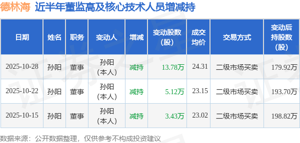 德林海:10月28日高管孙阳减持股份合计13.78万股