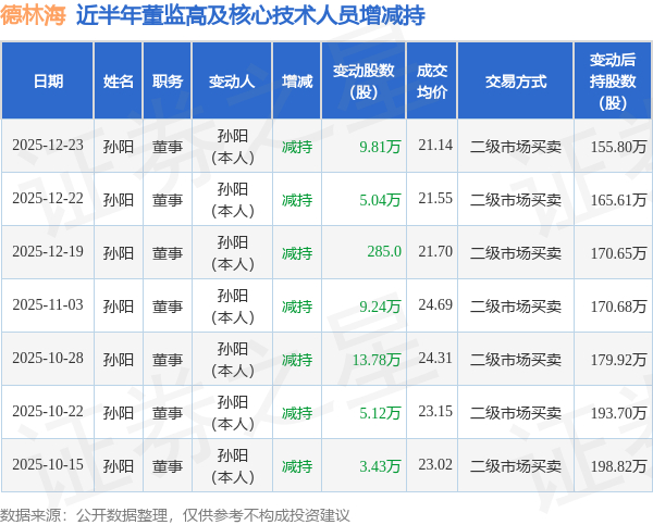 德林海:12月23日高管孙阳减持股份合计9.81万股