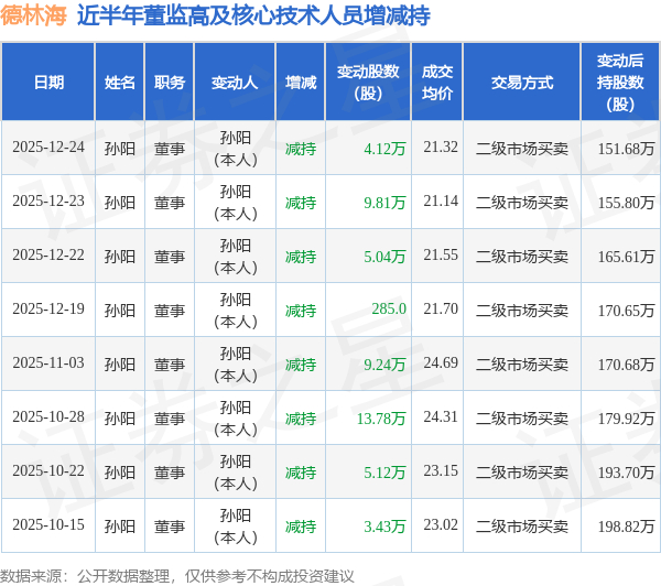 德林海:12月24日高管孙阳减持股份合计4.12万股