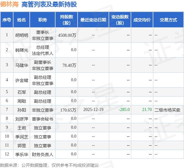德林海的高管列表及最新持股情况如下: