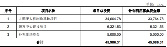 纵横股份于2021年2月10日在上交所科创板上市,发行数量为21,900,000股,均为新股,无老股转让,发行价格为23.16元/股,保荐机构(主承销商)为国泰君安证券股份有限公司,保荐代表人为蒋杰、徐开来。公司募集资金总额为50,720.40万元,募集资金净额为44,600.52万元,公司2021年2月4日披露的招股书显示,公司拟募集资金45,086.31万元,计划用于大鹏无人机制造基地项目、研发中心建设项目、补充流动资金。