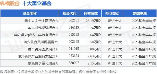 根据2025基金半年报公募基金重仓股数据,重仓该股的公募基金共7家,其中持有数量最多的公募基金为华安基金的华安大安全主题混合A。华安大安全主题混合A目前规模为1.84亿元,最新净值2.589(9月23日),较上一交易日下跌0.77%,近一年上涨60.91%。该公募基金现任基金经理为舒灏。舒灏在任的基金产品包括:华安新机遇灵活配置混合A,管理时间为2018年11月12日至今,期间收益率为54.81%;华安添禧一年持有期混合A,管理时间为2021年6月4日至今,期间收益率为9.73%;华安鼎安优选一年持有混合A,管理时间为2022年6月2日至今,期间收益率为15.73%。