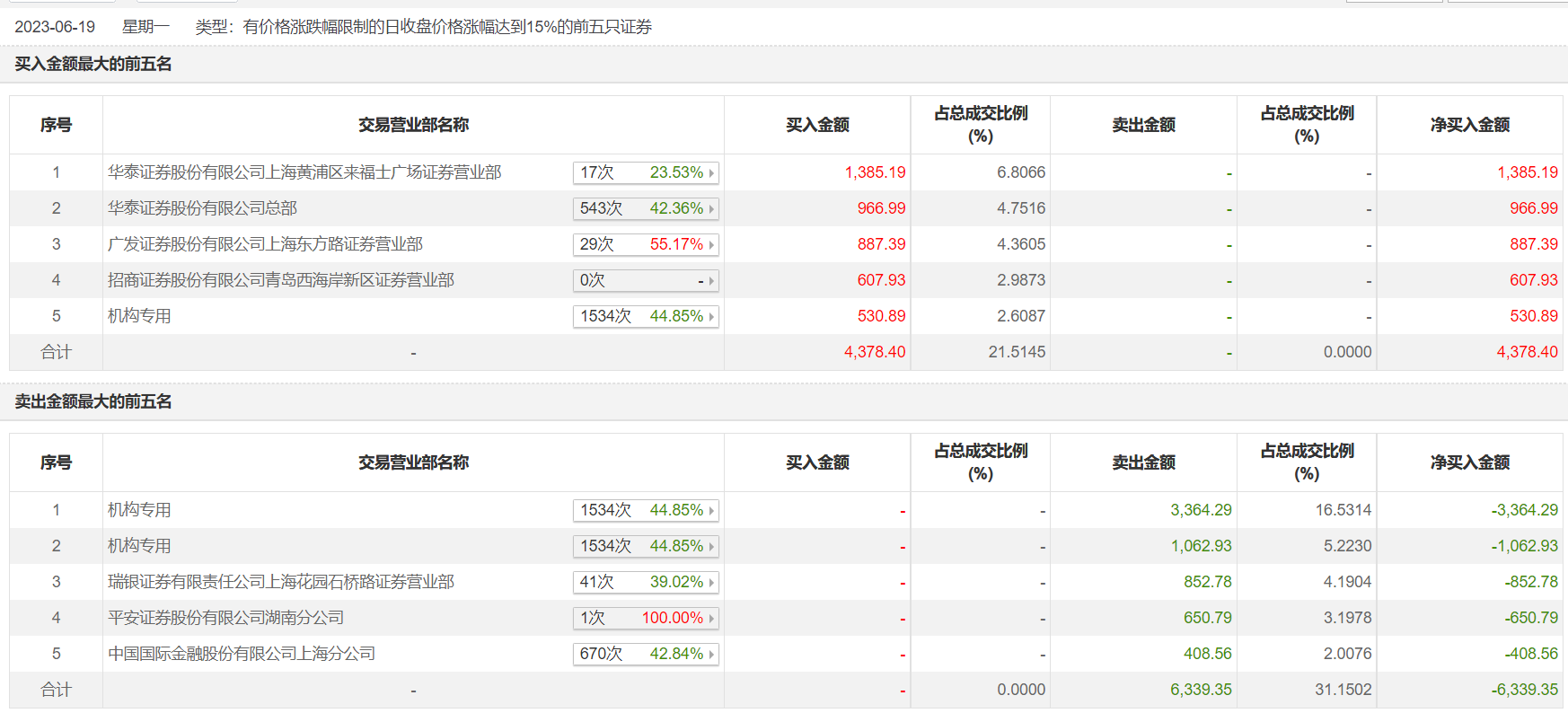 华依科技今日涨停,龙虎榜数据显示,上榜营业部席位全天成交1.07亿元,占当日总成交金额比例为52.66%。其中,买入金额为4378.4万元,卖出金额为6339.35万元,合计净卖出1960.94万元。