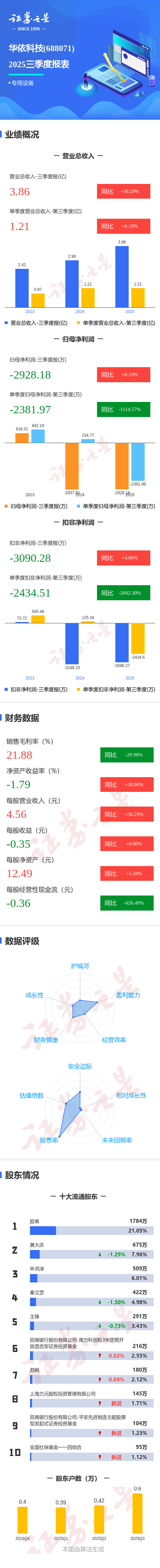 证券之星消息,华依科技2025年三季报显示,前三季度公司主营收入3.86亿元,同比上升30.29%;归母净利润-2928.18万元,同比上升0.33%;扣非净利润-3090.28万元,同比上升4.86%;其中2025年第三季度,公司单季度主营收入1.21亿元,同比上升0.19%;单季度归母净利润-2381.97万元,同比下降1114.57%;单季度扣非净利润-2434.51万元,同比下降2042.3%;负债率53.59%,财务费用1415.31万元,毛利率21.88%。