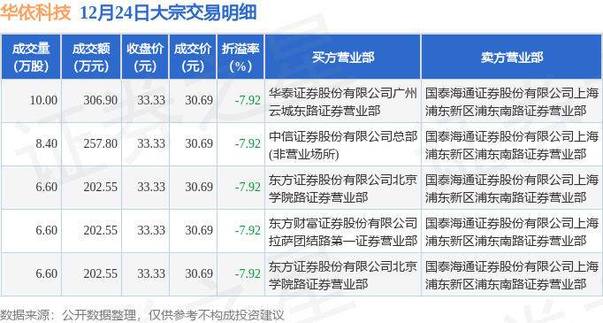 12月24日华依科技发生5笔大宗交易 成交金额1172.35万元