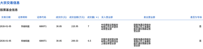 1月5日,华依科技大宗交易成交13.5万股,成交额416.48万元,占当日总成交额的4.67%,成交价30.85元,较市场收盘价34.31元折价10.08%。