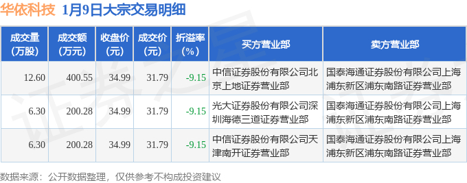 证券之星消息,1月9日华依科技发生大宗交易,交易数据如下: