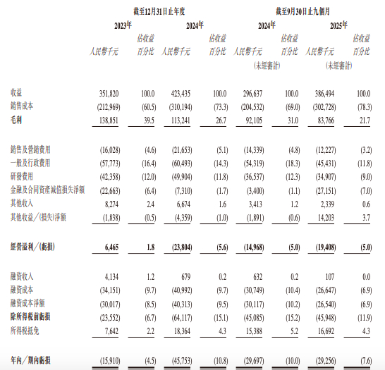 不过与营收规模持续增长形成鲜明对比的是,公司盈利状况持续恶化,亏损额度不断扩大。投资参考网记者梳理公司港股招股书披露的财务数据发现,2023 年、2024 年以及 2025 年前九个月,华依科技分别实现营业收入 3.52 亿元、4.23 亿元、3.86 亿元,整体呈现稳步增长态势,但同期净利润分别亏损 1591 万元、4575.3 万元、2925.6 万元,其中 2024 年净利润同比降幅达到 187%,亏损幅度急剧扩大。