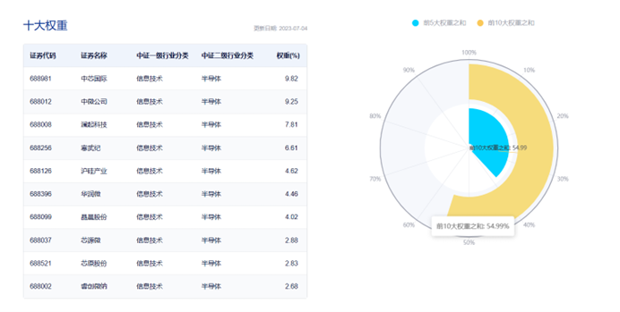 截至2023年7月4日,该指数前十大权重股包括中芯国际、中微公司、澜起科技、寒武纪、沪硅产业等,前十大权重股合计占比54.99%。(数据来源:中证指数公司,指数成份股不代表个股推荐)