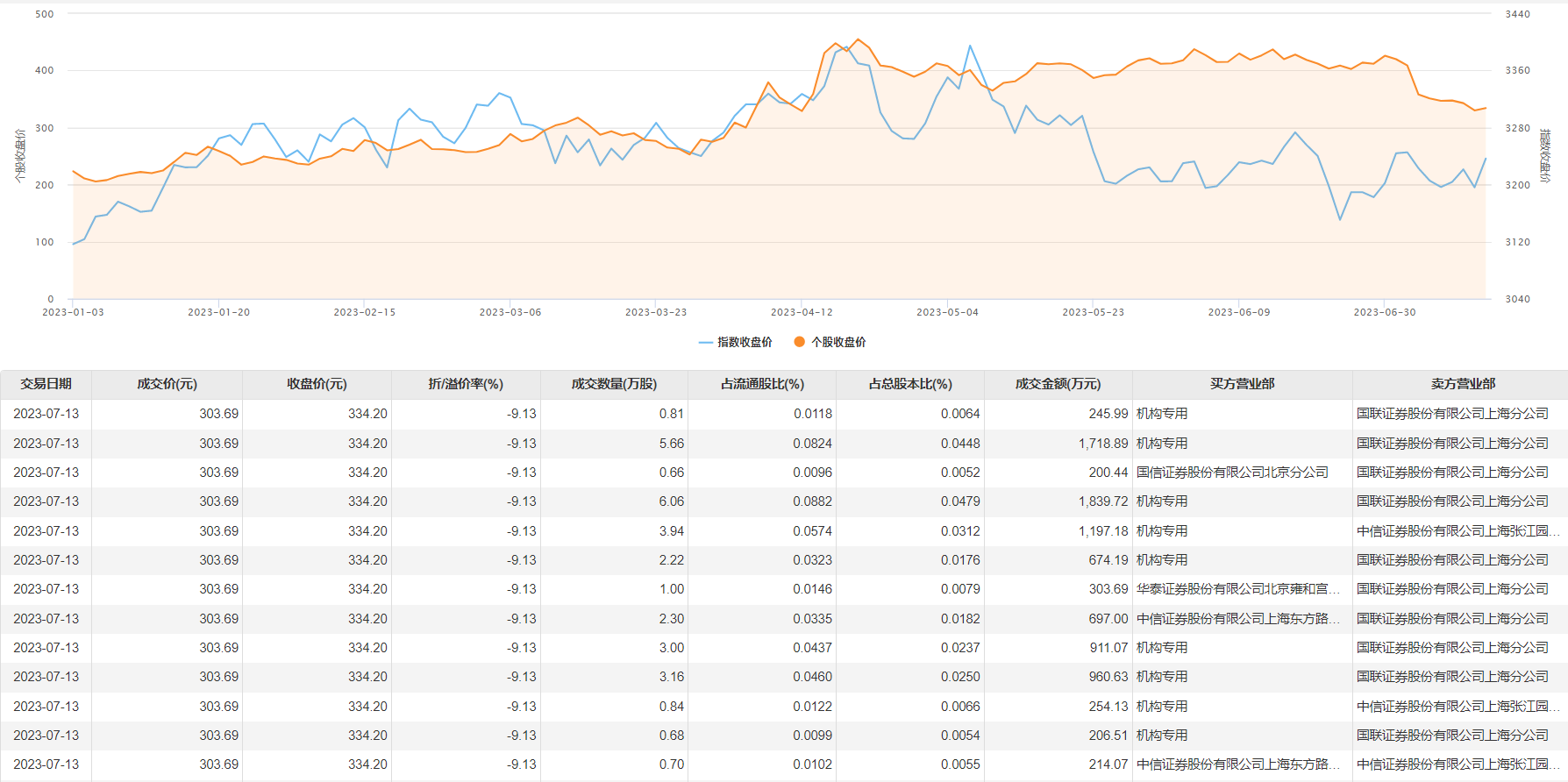 7月13日大宗交易成交31.03万股,成交额9423.51万元,占当日总成交额的12.01%,成交价303.69元,较市场收盘价334.2元折价9.13%。