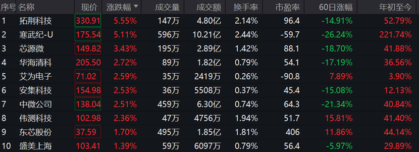 图片来源:wind该基金紧密跟踪上证科创板芯片指数,该指数上涨0.97%,指数成份股中,拓荆科技上涨5.55%,寒武纪-U上涨5.11%,芯源微、华海清科等个股跟涨。