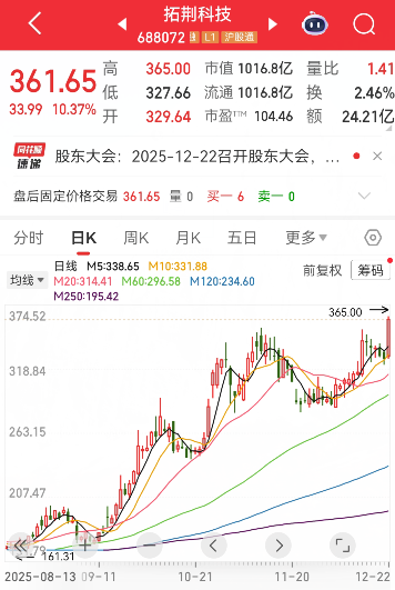 人民财讯12月22日电,12月22日,拓荆科技股价大涨10.37%,最新收盘价达到361.65元/股,创下历史新高。截至目前,公司A股市值突破1000亿元大关,达到1016.83亿元。今年前三季度,公司实现净利润5.57亿元,同比增长105.14%。