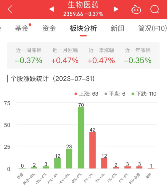 中国经济网北京7月31日讯今日,生物医药板块整体跌幅0.37%,其中63只股票上涨,6只股票平盘,110只股票下跌。