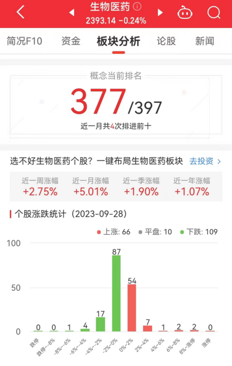 中国经济网北京9月28日讯今日,生物医药板块整体涨幅-0.24%,其中66只股票上涨,10只股票平盘,109只股票下跌。