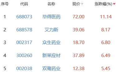 其中,毕得医药、艾力斯、众生药业、新莱应材、双鹭药业位列板块涨幅前五位,涨幅分别为11.14%、8.17%、6.80%、6.49%、5.45%。
