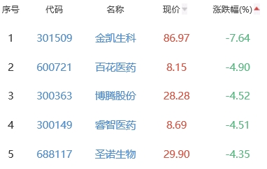 金凯生科、百花医药、博腾股份、睿智医药、圣诺生物位列涨幅榜后五位,涨幅分别为-7.64%、-4.90%、-4.52%、-4.51%、-4.35%。