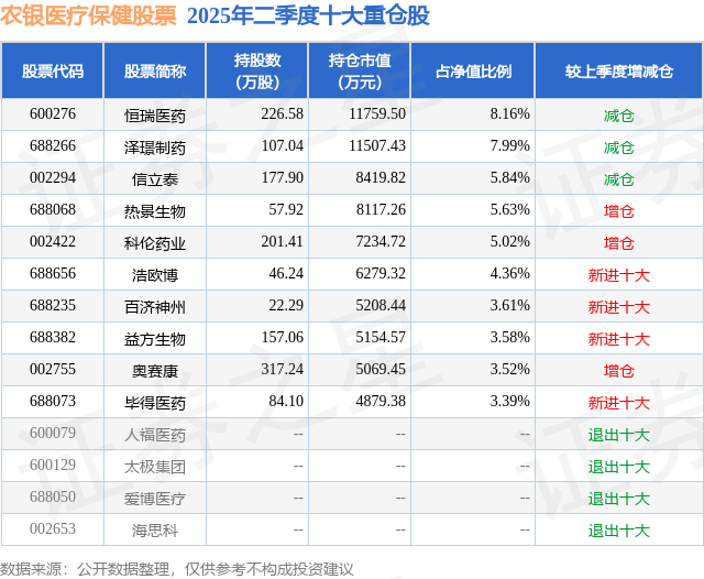 根据2025基金半年报公募基金重仓股数据,重仓该股的公募基金共13家,其中持有数量最多的公募基金为农银汇理基金的农银医疗保健股票。农银医疗保健股票目前规模为14.41亿元,最新净值1.8155(10月9日),较上一交易日下跌2.12%,近一年上涨20.64%。该公募基金现任基金经理为梦圆。梦圆在任的基金产品包括:农银汇理创新医疗混合,管理时间为2021年2月24日至今,期间收益率为-41.17%。