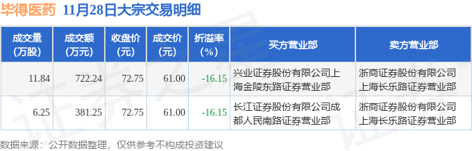 11月28日毕得医药现2笔折价16.15%的大宗交易 合计成交1103.49万元
