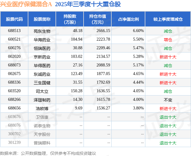 兴业医疗保健混合A的前十大重仓股如下: