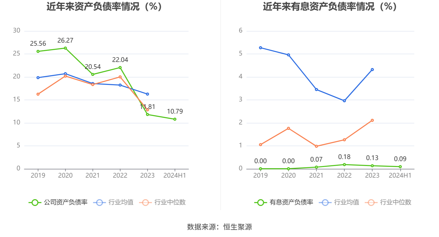 在偿债能力方面,公司2024年上半年末资产负债率为10.79%,相比上年末下降1.02个百分点;有息资产负债率为0.09%,相比上年末下降0.04个百分点。