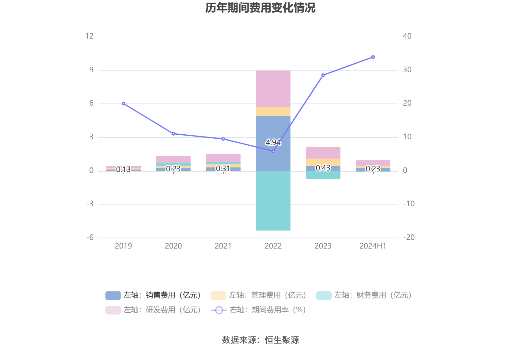 2024年上半年,公司期间费用为8424.17万元,较上年同期增加8657.93万元;期间费用率为33.95%,较上年同期上升35.09个百分点。其中,销售费用同比增长13.33%,管理费用同比下降22.75%,研发费用同比增长2.76%,财务费用由去年同期的-9956.21万元变为-1042.26万元。
