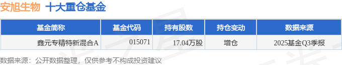 持有安旭生物最多的基金为鑫元专精特新混合A,目前规模为0.97亿元,最新净值0.6552(10月31日),较上一交易日上涨0.24%,近一年上涨28.27%。该基金现任基金经理为陆杨。