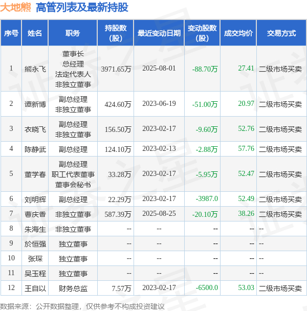 大地熊的高管列表及最新持股情况如下:
