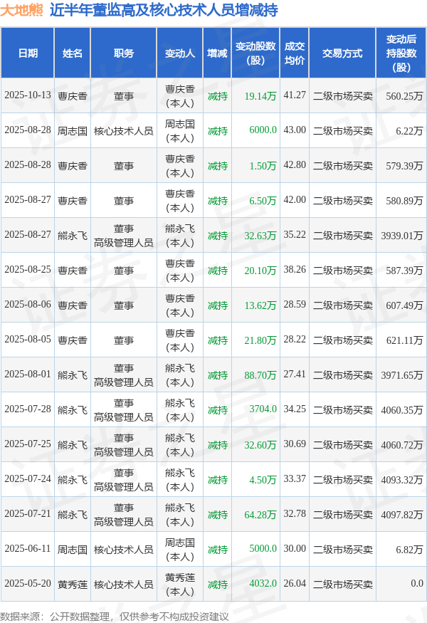 大地熊近半年内的董监高及核心技术人员增减持详情如下:
