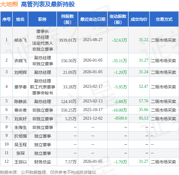 大地熊的高管列表及最新持股情况如下: