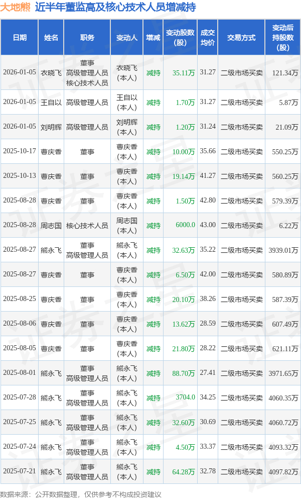 大地熊近半年内的董监高及核心技术人员增减持详情如下: