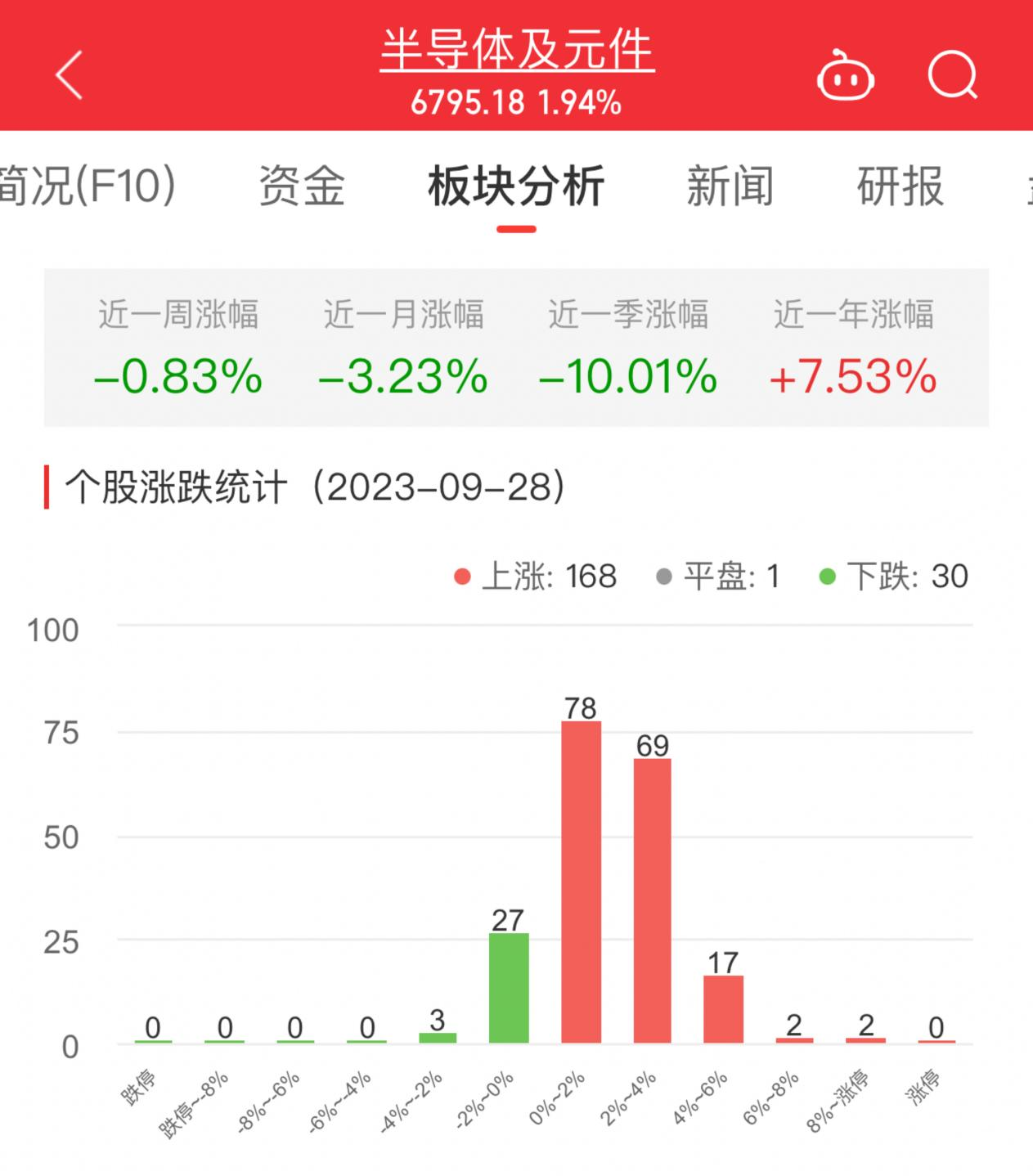 中国经济网北京9月28日讯 今日,半导体及元件板块整体涨幅1.94%,其中168只股票上涨,1只股票平盘,30只股票下跌。