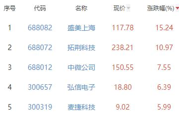 其中,盛美上海、拓荆科技、中微公司、弘信电子、麦捷科技位列板块涨幅前五位,涨幅分别为15.24%、10.97%、7.55%、6.39%、5.99%。