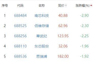 南芯科技、佰维存储、寒武纪、东芯股份、思瑞浦位列涨幅榜后五位,涨幅分别为-2.90%、-2.30%、-2.25%、-1.96%、-1.92%。